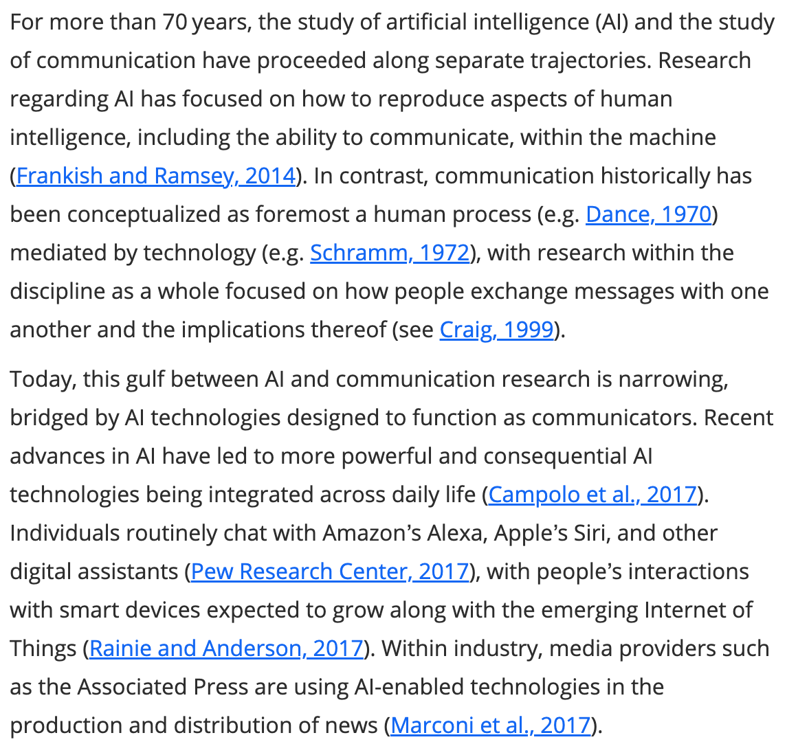 [1] "For more than 70 years, the study of artificial intelligence (AI) and the study of communication have proceeded along separate trajectories. Research regarding AI has focused on how to reproduce aspects of human intelligence, including the ability to communicate, within the machine (Frankish and Ramsey, 2014). In contrast, communication historically has been conceptualized as foremost a human process (e.g. Dance, 1970) mediated by technology (e.g. Schramm, 1972), with research within the discipline as a whole focused on how people exchange messages with one another and the implications thereof (see Craig, 1999). Today, this gulf between AI and communication research is narrowing, bridged by AI technologies designed to function as communicators. Recent advances in AI have led to more powerful and consequential AI technologies being integrated across daily life (Campolo et al., 2017). Individuals routinely chat with Amazon's Alexa, Apple's Siri, and other digital assistants (Pew Research Center, 2017), with people's interactions with smart devices expected to grow along with the emerging Internet of Things (Rainie and Anderson, 2017). Within industry, media providers such as the Associated Press are using AI-enabled technologies in the production and distribution of news (Marconi et al., 2017). In response, some communication scholars are advocating for the discipline to devote greater attention to understanding increasingly life-like and communicative AI technologies, people's interactions with them, and their implications (e.g. Gunkel, 2012a;Guzman, 2018;Jones, 2014;Peter and Kühne, 2018). However, communication researchers studying communicative AI face a substantial hurdle: AI and people's interactions with it do not fit neatly into paradigms of communication theory that for more than a century formed around how people communicate with other people (Gunkel, 2012a). This article's goal is to advance the study of AI and communication by examining the theoretical challenges posed by AI and meeting them by elucidating an alternative means of theorizing technology in relation to communication. To do so, we draw from scholarship within Human-Machine Communication (HMC), an emerging area of communication research focused on the study of the \"creation of meaning among humans and machines\" (Guzman, 2018: 1) and the refinement and development of theory related to people's interactions with technologies such as agents and robots (Spence, 2019). As we explain, what sets HMC apart is its focus on people's interactions with technologies designed as communicative subjects, instead of mere interactive objects. Based on this conceptual starting point of machine as communicator, we outline a research agenda focused on the emerging questions regarding people's communication with AI technologies designed to function as communicators. Before proceeding, we want to acknowledge that it is not feasible to capture all the elements of AI and communication within a single article, and several relevant lines of inquiry are yet emerging within particular fields such as journalism studies (e.g. Lewis et al., 2019). Thus, our purpose is less about comprehensively categorizing the discipline and more about using HMC as a theoretical entry point for stimulating scholarship on AI and its place within communication, opening up new questions while casting new light on old ones. The term AI is polysemous, encompassing efforts to understand human intelligence by recreating a mind within a machine and to develop technologies that perform tasks associated with some level of human intelligence (Broussard, 2018;Frankish and Ramsey, 2014). Our use of AI within this article is reflective of the latter definition, focused on the pragmatic aims of AI and the technologies designed to carry out specific tasks within the communication process that were formerly associated with humans. Examples of what we are calling communicative AI include conversational agents, social robots, and automated-writing software. These technologies have primarily developed out of advances within the AI subfields of Natural Language Processing (NLP) and Natural Language Generation (NLG). At their most basic level, NLP and NLG have the intertwined goals of processing human communication well enough to enable machines to make sense of messages presented in human language, rather than machine language, and creating messages in human language (Allen, 2003). For example, voice-based assistants evolved out of efforts in NLP, while automated-writing programs are underpinned by NLG (Dörr, 2016). AI technologies vary in how they function as a communicator, from interpersonal interlocutor to content producer. Voice-based assistants, such as Amazon's Alexa, vocally respond to human questions and requests. Embodied robots interact verbally and nonverbally with people (Peter and Kühne, 2018). Automated programs called bots enter into text-based social media interactions by posing as human conversational partners, influencing the tone and substance of these exchanges (Ferrara et al., 2016). News-writing programs develop narratives from raw data that appear alongside human-produced stories and cannot be easily distinguished from them (Clerwall, 2014;Graefe et al., 2018). What these technologies share is that by functioning as a communicator, they all step into a role that, within the conceptual confines of the communication discipline, historically has been restricted to humans. In doing so, AI more than facilitates communication: it automates communication (Reeves, 2016) as well as the social processes dependent upon it (Gehl and Bakardjieva, 2017). AI technologies of communication are designed as something with which people exchange messages, a departure from the historical role of media developed as the means through which people communicate with one another (Gunkel, 2012a). It is true that talking technologies existed before AI, such as car navigation syst